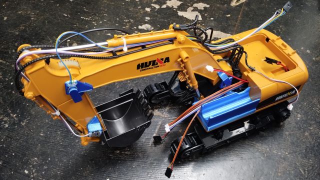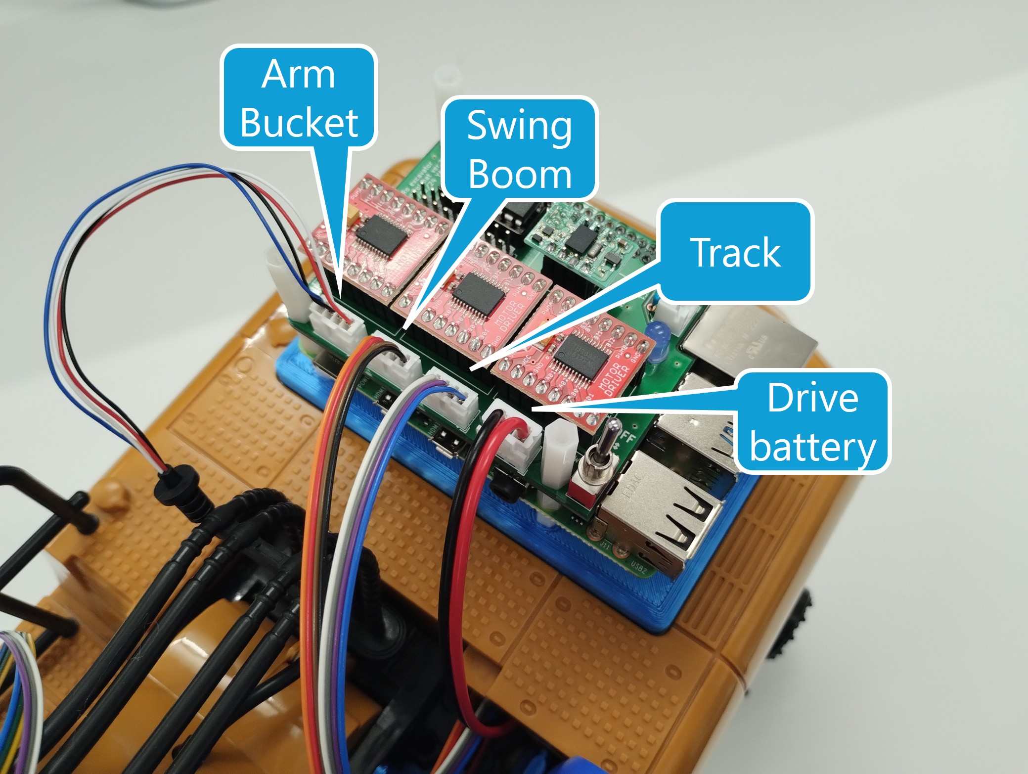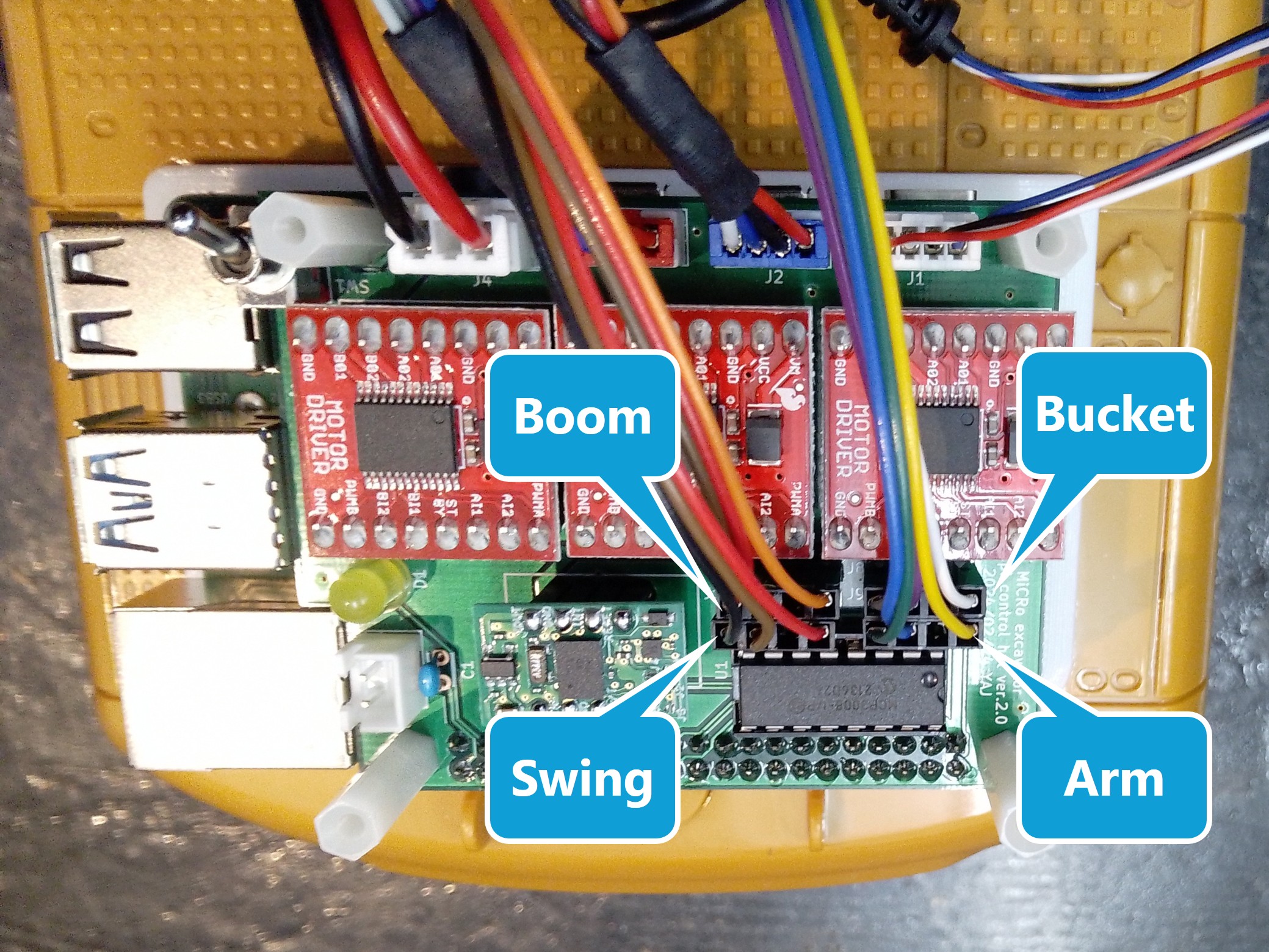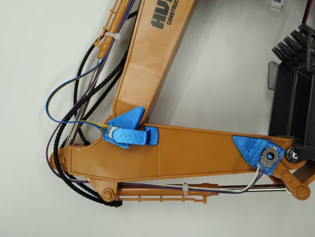 アームとバケットの関節角度を計測するためのポテンショメータにつながるケーブルは長いので,動作の邪魔にならないようにまとめておきます.